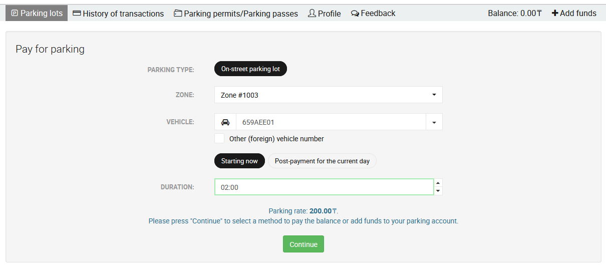 To make a post-payment, you must select «Парковки Астаны» in the application or in your personal account of astanapark.kz the «Post-payment per day» function by specifying the actual time of placing the vehicle in the parking lot.